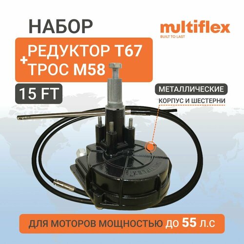 Применяется для лодочных моторов до 55л. с. Редуктор Т67 металлический корпус, шестерни металл, полная перекладка руля 2,5 оборота. Диаметр троса М58 12,5мм, Полезный ход 230мм, Диаметр спирали 6,2мм, Минимальный радиус изгиба 200мм, Максимальная рабочая нагрузка 120кг. Длина рулевого троса указана рубашка + шток рулевого троса. (Пример 1,5 метра рубашка + 30см шток рулевого троса, общая длина троса 1,8м или 6ft) Производитель комплекта Мультифлекс Индия