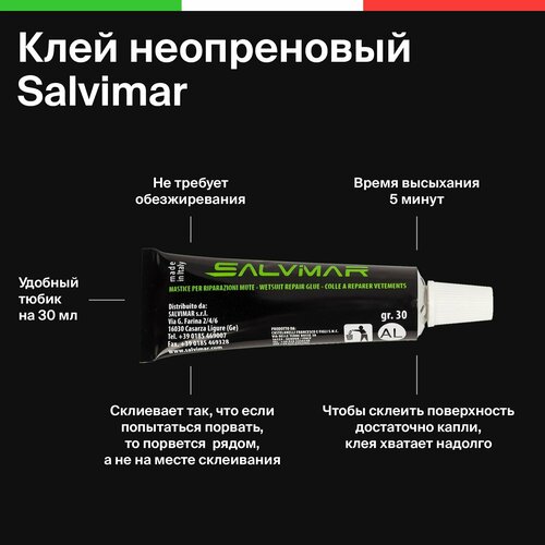 Предназначен клей Salvimar для мелкого ремонта неопреновых изделий: Подводных гидрокостюмов, носок, перчаток, а также сумок пошитых из неопрена.