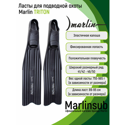 Ласты Marlin Triton (Марлин Тритон) – легкие ласты для подводной охоты и фридайвинга. Фиксированная лопасть изготовлена из полипропилена, имеет среднюю жесткость. Удобная калоша изготовлена из термопластичной резины с разной степенью жесткости. Жесткая подошва увеличивает передаваемую энергию, мягкий верх обладает хорошей эластичностью обеспечивает удобство одевания и комфорт при длительном использовании. Благодаря слому лопасти в 17 градусов, обеспечивается оптимальный угол наклона ласты к плоскости стопы, в результате чего снижается нагрузки на мышцы стопы и голени. Расположенные по всей длине лопасти направляющие потока предотвращают занос лопасти на бок.