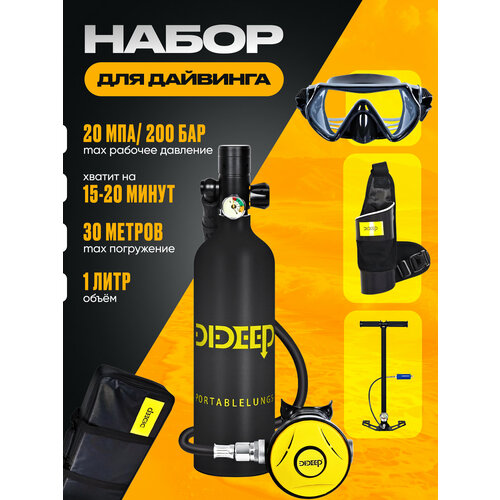 Набор для дайвинга DeepBlue — компактное и простое в использовании оборудование для дайвинга, которое отлично подойдет для купания, снорклинга и прогулок в море. В комплект входит мини акваланг с алюминиевым баллоном объёмом 1 литр. Он выдерживает давление до 200 Бар и позволяет находиться под водой до 20 минут. Такой формат удобен для подводного плавания на глубине до 10 метров или как резервный источник воздуха на глубине до 30 метров.