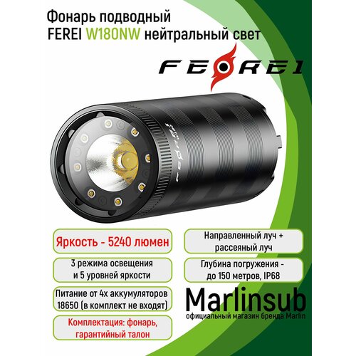 Фонарь Ferei W180NW — мощный профессиональный фонарь для дайвинга и подводной охоты нейтральным белым светом, с тремя режимами освещения и гибкой регулировкой яркости. Выдерживает погружение до 150 метров, обеспечивает световой поток до 5240 люмен (в версии с нейтральным белым светом) и дальность освещения до 350 метров.