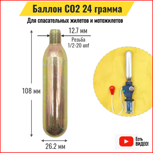 Баллон 24 (25) грамма CO2 для перезарядки спасательных жилетов и мотожилетов.