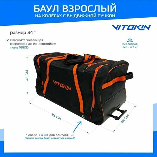 Баул на колесах хоккейный с карманами и ручкой VITOKIN, размер 34" взрослый черный с оранжевым