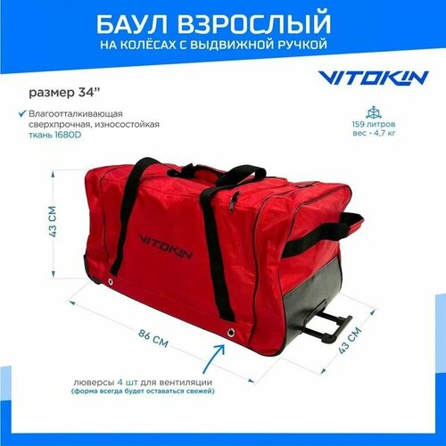 Баул на колесах хоккейный с карманами и ручкой VITOKIN, размер 34" взрослый красный