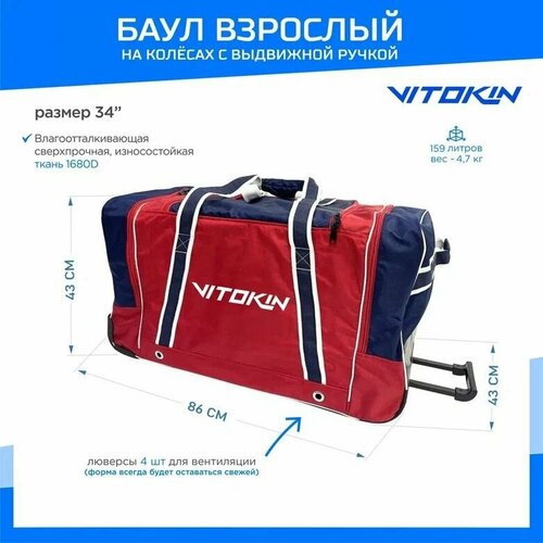 Баул хоккейный на колесах с выдвижной ручкой VITOKIN - это специальная сумка, предназначенная для переноски и хранения спортивного снаряжения хоккеиста.